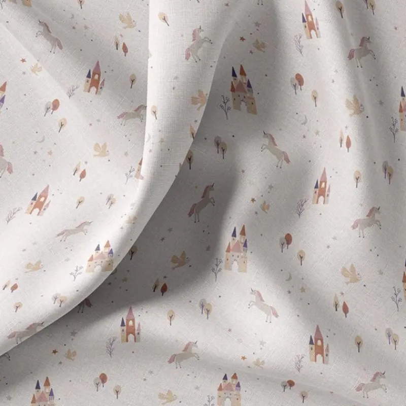 Eventyrligt junior sengesæt fra Nørgaard Madsen. Junior sengesættet er i en duset rosa farve med fine enhjørninger og slotte, produceret i en blød Oeko Tex certificeret bomuld og syet i Danmark.