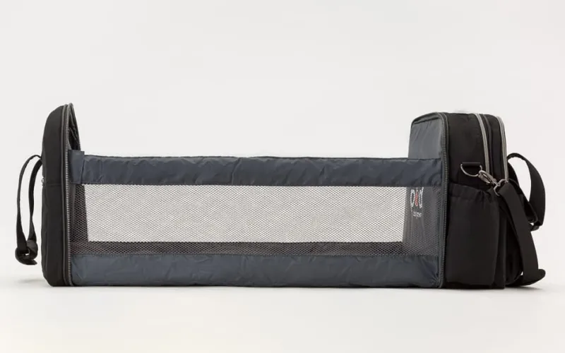 Ved at bruge de medfølgende letvægtsstænger til at sikre siderne, kan din baby sove sikkert og komfortabelt i den udfoldelige sengesektion. Samlingen af sektionen tager mindre end et minut! En polstret madras følger med tasken og kan bruges som underlag i rejsesengen eller som pusleunderlag.