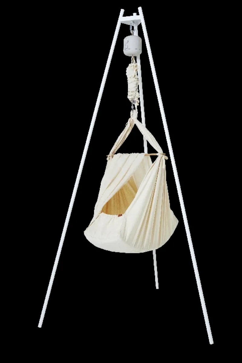 Designet og udviklet i Danmark. Basic vuggestativ er specialdesignet til brug af slyngevugge og tvillingeslyngevugge – både med og uden vuggemotor.
