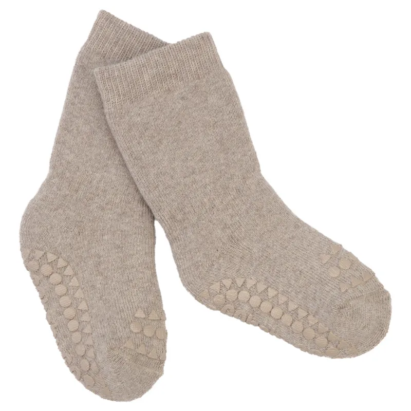 GoBabyGo skridsikre strømper i uld har special designede gummi dutter under fødderne og ovenpå tæerne, så barnet ikke glider når det skal i gang med at lære at kravle og gå.