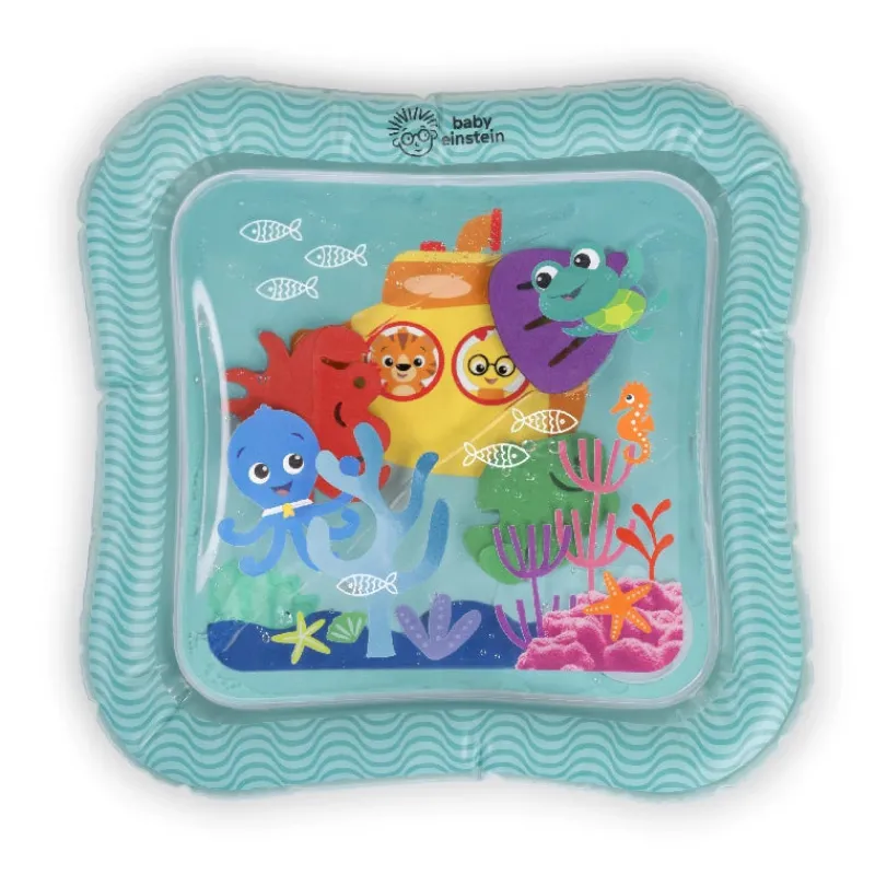 Oplev undervandsverdenen sammen med din baby og Baby Einstein Opus’s Ocean of Discovery vandmåtte. Du skal blot fylde midten af madrassen med vand og puste den yderste kant op med luft. Mens barnet leger i siddende eller liggende stilling, kan det arbejde med muskeludvikling, mens det bevæger de seks svømmende havdyr under overfladen. Perfekt til nysgerrige børn fra 0+. Når baby rører ved måtten og ser undervandsdyrene svømme, lærer barnet om årsag og virkning. Vandmåtten hjælper med at engagere spædbørn og småbørn og fremmer samtidig udviklingen af grovmotoriske færdigheder hos barnet. Rengøring er yderst let – luk vand og luft ud, tør måtten af, og fold den sammen til opbevaring eller transport. Brug måtten derhjemme eller tag den med dig på eventyr på farten, så dit barn kan opleve undervandsverdenen med alle sanser når som helst og hvor som helst.