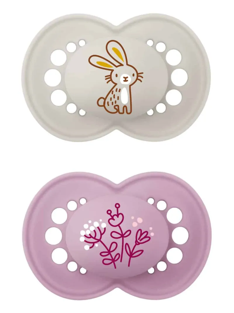 Klassisk sut, der er skånsom mod huden takket være de store lufthuller og den noprede inderside. Sugedelen er fremstillet af naturmaterialet latex, som føles naturligt og behageligt. Latex kan bedre holde til at blive bidt i end silikone. MAM Original 2-pak ligger i en praktisk opbevarings- og steriliseringsæske, som gør det nemmere at sterilisere sutterne i mikrobølgeovnen.