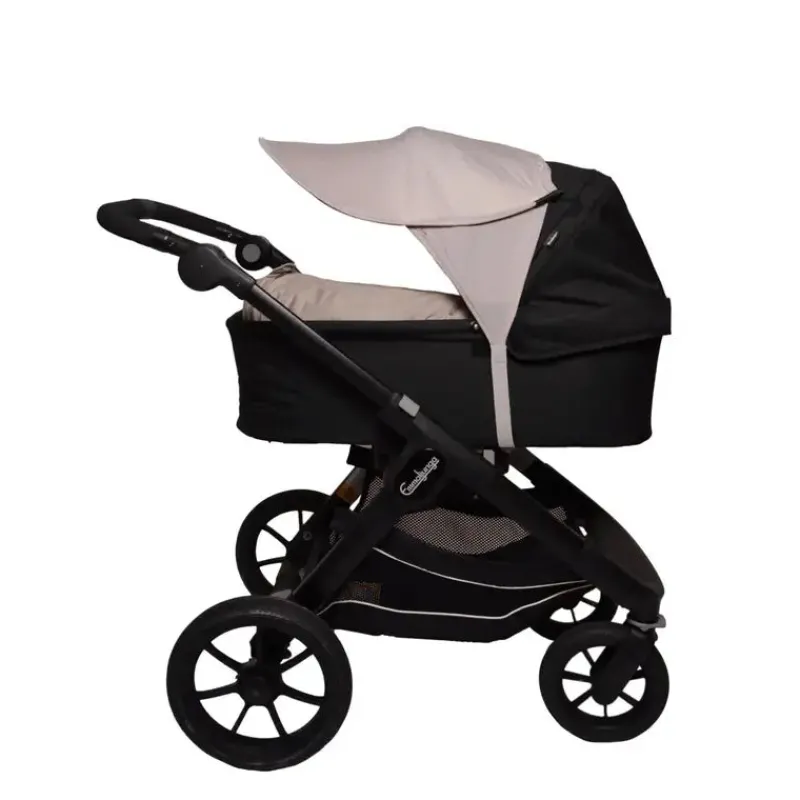 Fastgør båndet under barnevognskassen eller ryggen på klapvognen. Stram båndet i siderne for at få det tilpas stramt. Båndet har også et spænde som kan åbnes, så du eventuelt kan fastgøre det gennem understellet på vognen. Solskærmen kan trækkes ud til siderne alt efter hvor solen kommer fra. Træk den længere frem på kalechen, hvis solen står lavt.