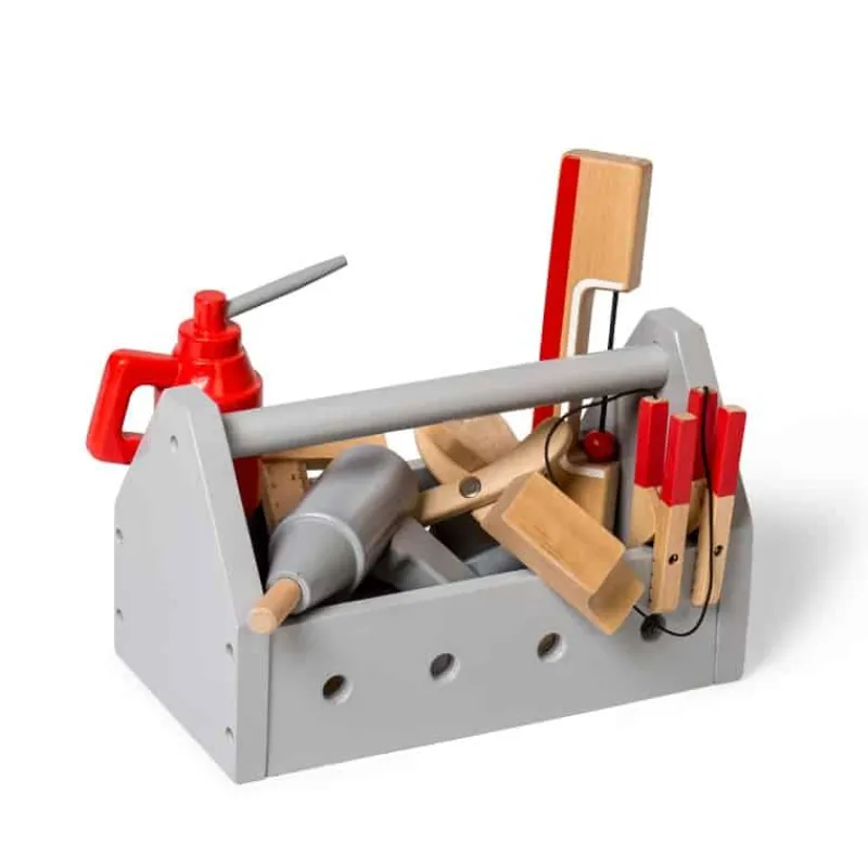 Med til værkstedsbænken hører også en praktisk værktøjskasse hvis den lille håndværker skal ud af huset og lave noget. Og til at holde styr på skruer og smådele en praktisk opbevaringskasse.