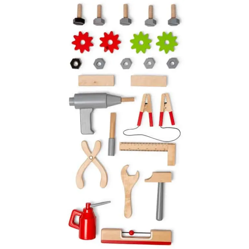 Der medfølger bl.a. boremaskine, oliekande, vatterpas, startkabler, vinkel, hammer og meget andet, i alt 25 dele altsammen i træ.