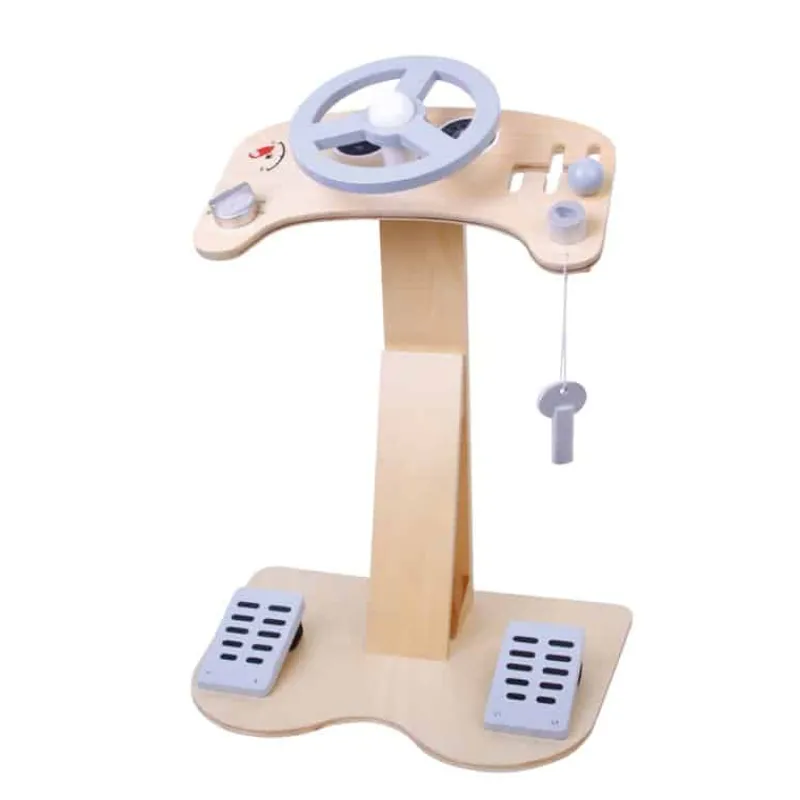MaMaMeMo Bilrat i træt. Sæt nøglen i, drej på knappen, træd sømmet i bund og kom op i gear. Rattet har knap med kliklyd, speedometer og benzinmåler med flytbare visere, gearskift, nøgle på snor, og pedaler, som kan trædes i bund. Super sjov billeg for de små.