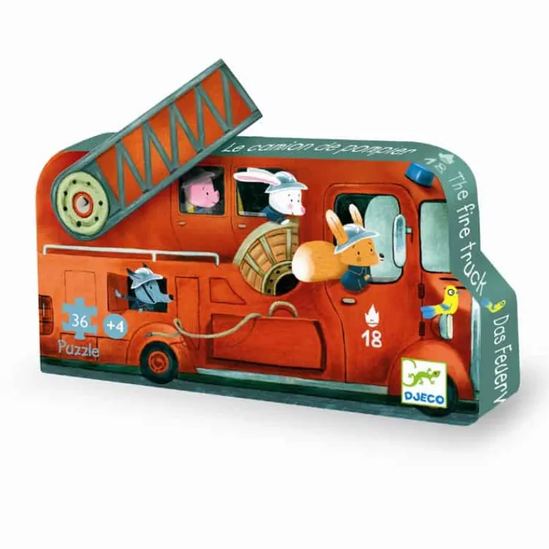 Djeco Silhuet Puslespil – Brandil 16 Brikker, den flotte brandbil er et rigtig fint silhuetpuslespil fra Djeco, i en kraftig flot silhuetæske. Bag på æsken vises motivet samt brikkernes størrelse. Dette pappuslespil indeholder 16 kraftige brikker