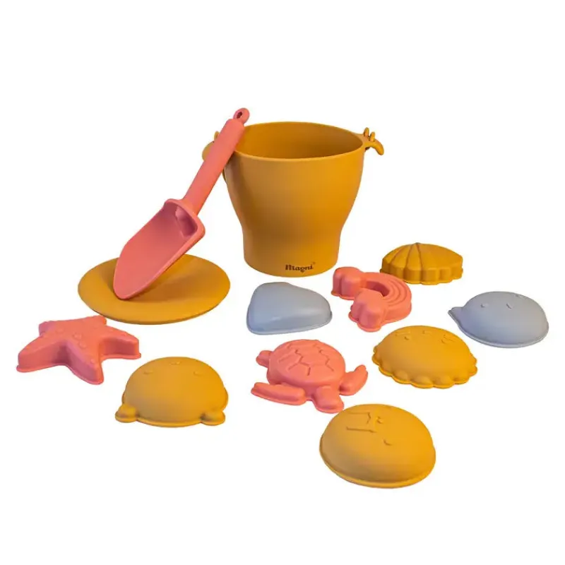 Lækkert strandsæt i silikone. Sættet består af spand med låg, skovl og 9 figurer. Figurerne er blandt andet formet som skildpadde, såstjerne, musling, regnbue, hjerte + 4 forskellige dyrehoveder. Dette strandsæt er i farven honning gul. 6m+