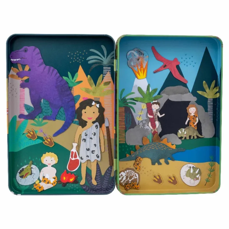 Legetid i en praktisk magnetisk æske! Indeholder 3 ark med magneter, så du kan have det sjovt med at klæbe over 50 forkellige, sjove magneter på de 2 sjove scener på indersiden af ??din æske og lade din fantasi løbe løbsk og skabe fantastiske billeder med dinosaur og andre fantasifulde dyr..