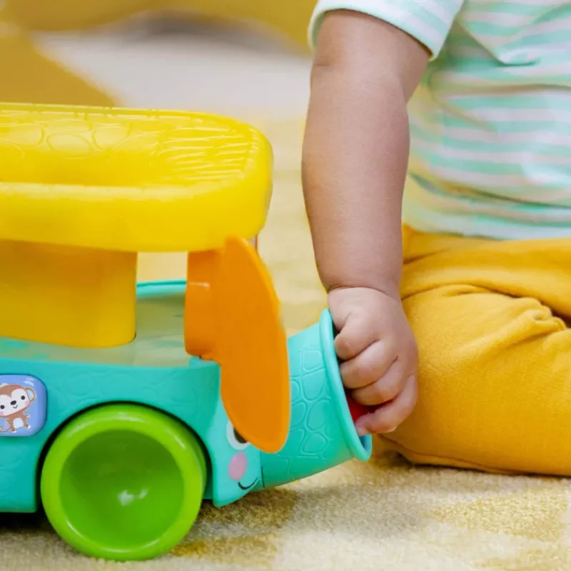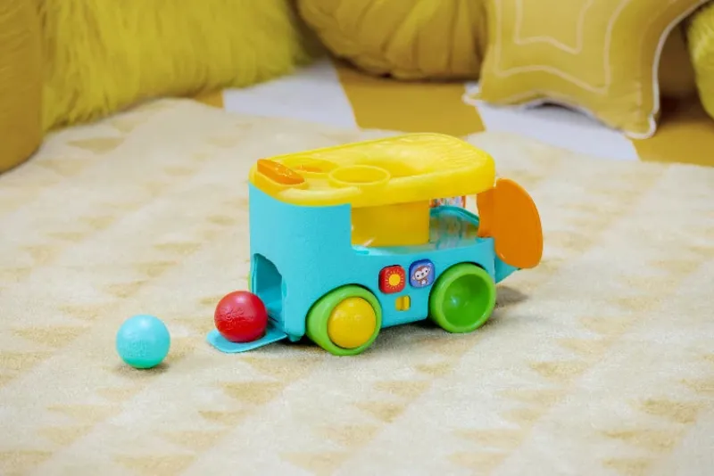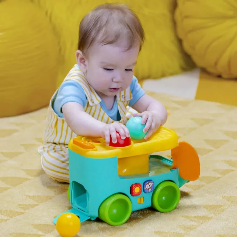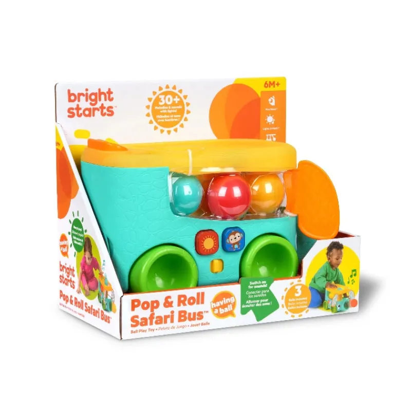 – Boldspillet i Bright Starts Pop & Roll Safari Bus træner finmotorikken og sørger for gode grin; smid boldene i de to øverste huller, eller klem dem ud af elefantens snabel.