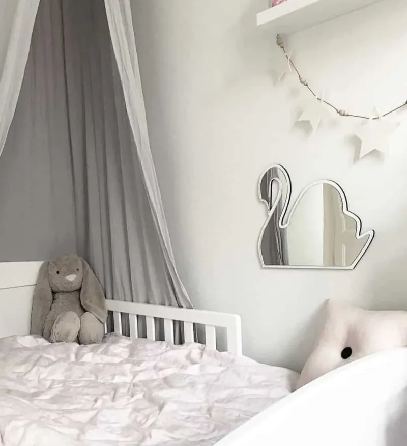 Dette eventyrlige svane børnespejl er lavet af akryl, hvilket vil sige at spejlet ikke har nogle skarpe hjørner og det ikke kan smadre. Det er derfor ekstra velegnet til børneværelset. Brug det ved puslepladsen eller tumlehjørnet hvor babyen skal træne nakke/ryg. Og når barnet er ældre kan det sættes i en højde hvor de kan se sig selv i spejlet eller brug spejlet som pynt på værelset. Mulighederne er mange og du kan rykke rundt på spejlet lige så mange gange du har lyst til.