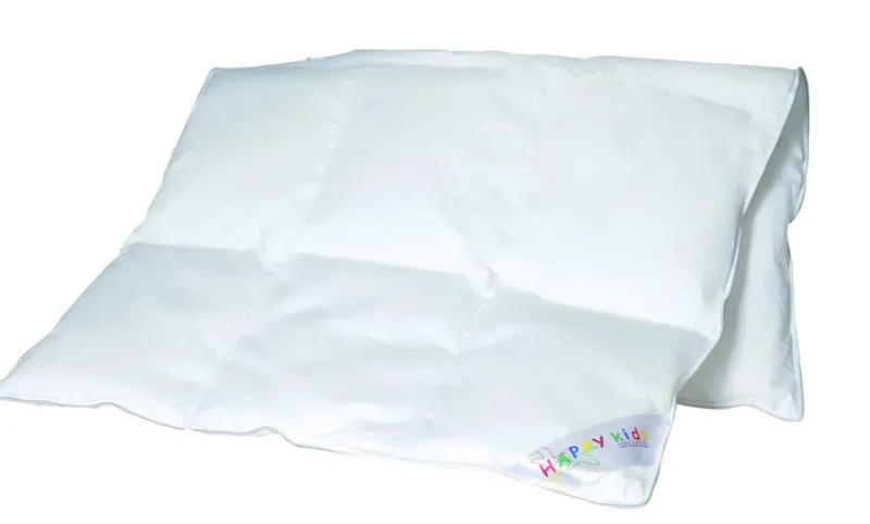 Happy Kids helårs baby dyne. Lækker helårs baby dyne i bæreevne 10. Mål 67×100 cm med 140 gram europæiske andedun 90% og småfjer 10%. Våret er Bomulds Cambric. Kan vaskes på 60 grader skånevask med dunvaskemiddel og tørretumbles