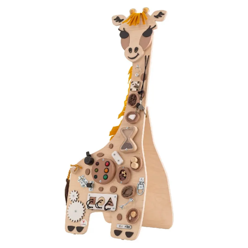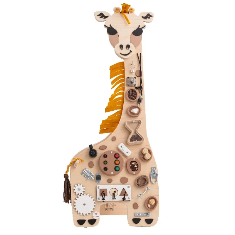 Giraffen Frank er fra Afrika, og den mest udnikke i Foxy-familien. Flink og stærk men også følsom. Sansepuderne adskiller hende fra de andre aktivitetstavler. Denne model kan både stå frit på gulvet og monteres på væggen.