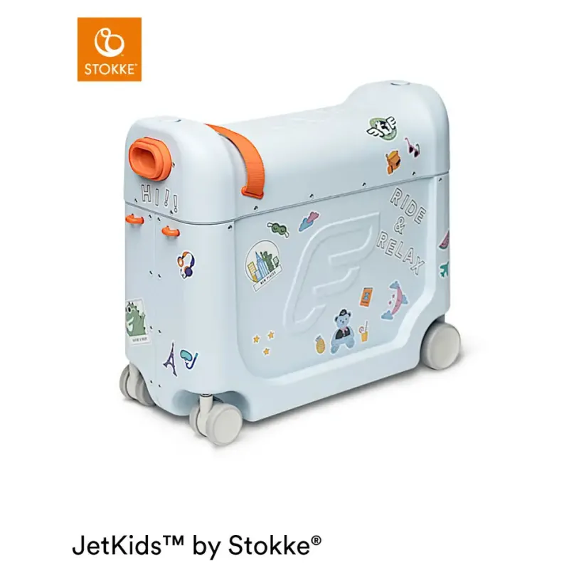 JetKids™ by Stokke® BedBox™ – Blue Sky, er verdens eneste ride-on kuffert til børn, som kan bruges som en flyseng eller benstøtte.