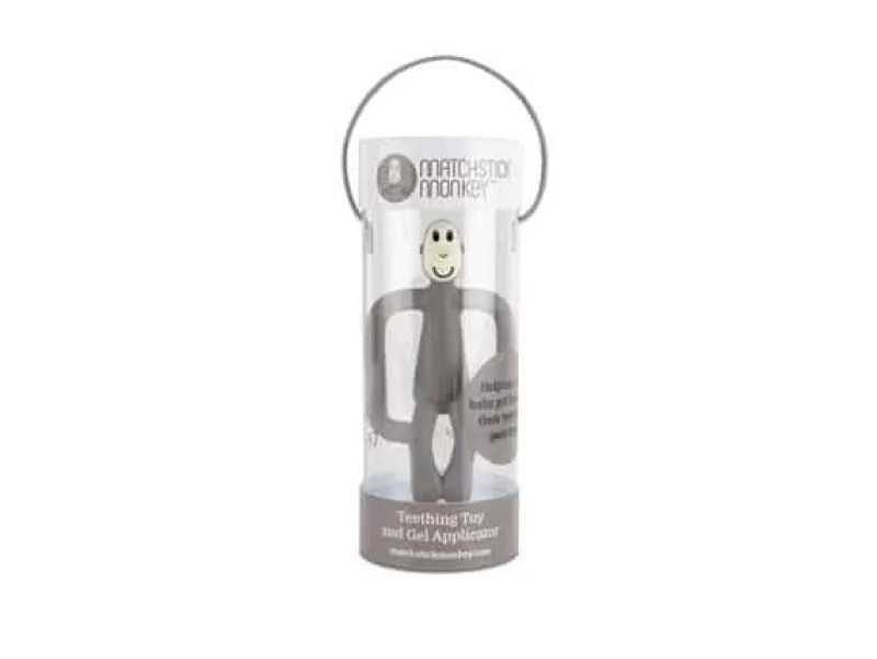 Matchstick Monkey Bidering – Grå. Sød lille bidering af blød silikone med ergonomisk design, så de små fingre nemt kan få fat i- og holde ved den. Bideringen er blød mod babys ømme gummer, når tænderne finder vej ud. Abens baghoved er designet med små bløde knopper, som kan afhjælpe kløe på gummerne. Den kan puttes i fryseren, så den er kold og dejlig at bide i.