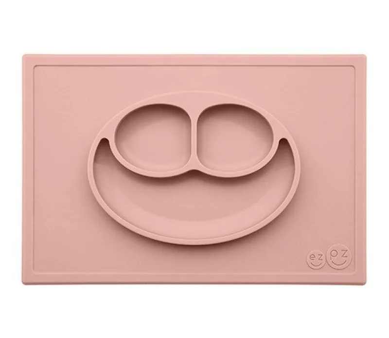 Ezpz Happy Mat er en – alt i én – tallerken og dækkeserviet i et. Produceret af højeste EU standard silikone (100%) som er helt fri for BPA, Phthalater, eller PVC. Happy Mat suger sig helt fast til bordet således at barnet ikke kan tippe eller løfte selve tallerknen. Fantastisk at skabe sjove, spændende og dekorative måltider til barnet.