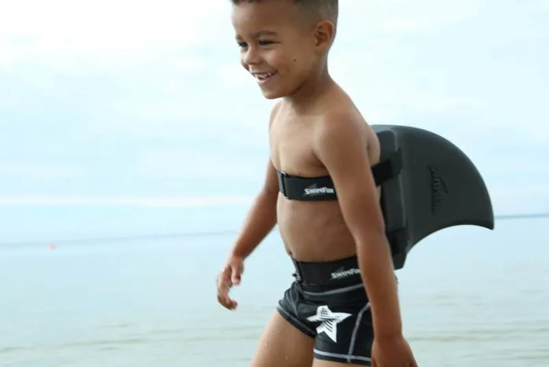 SwimFin Hajfinne – Antracitgrå. Svømmefinnen fra Swimfin spændes på ryggen og er en genial måde at hjælpe barnet til at svømme naturligt på. Finnen er designet til at generere opdrift, og hjælper derved barnet til at holde sig ovenvande – helt uden at hæmme barnets bevægelser og leg.