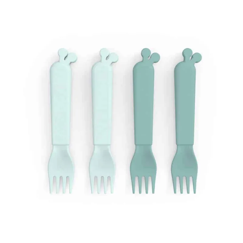 Når din tumling øver sig i at spise selv, er det godt at have rigeligt med gafler på lager. Kiddish gaflerne med Raffi ører passer perfekt i en lille hånd og gør det sikkert og nemt for din tumling at øve sig i at spise med bestik. Kiddish gaflerne er bæredygtige og produceret i Danmark. Når gaflerne er slidt op, kan de sorteres som hård plast og genanvendes til at producere nye produkter til hverdagen. En praktisk 4-pak med Kiddish gafler i to blå nuancer. Gaflerne har en mat, silkeblød overflade og passer perfekt til resten af Kiddish kollektionen.