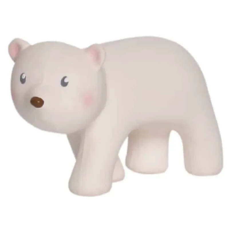 En sød lille isbjørn. Den er fantastisk til små ømme tænder og nemt for barnet at gribe og klemme om. Produktet har en lille klokke, der laver små ranglelyde som vil glæde og underholde de små. Produktet er Fremstillet af naturgummi, der høstes fra gummitræer, med en 12-årig livscyklus. BPA og phtalates fri.