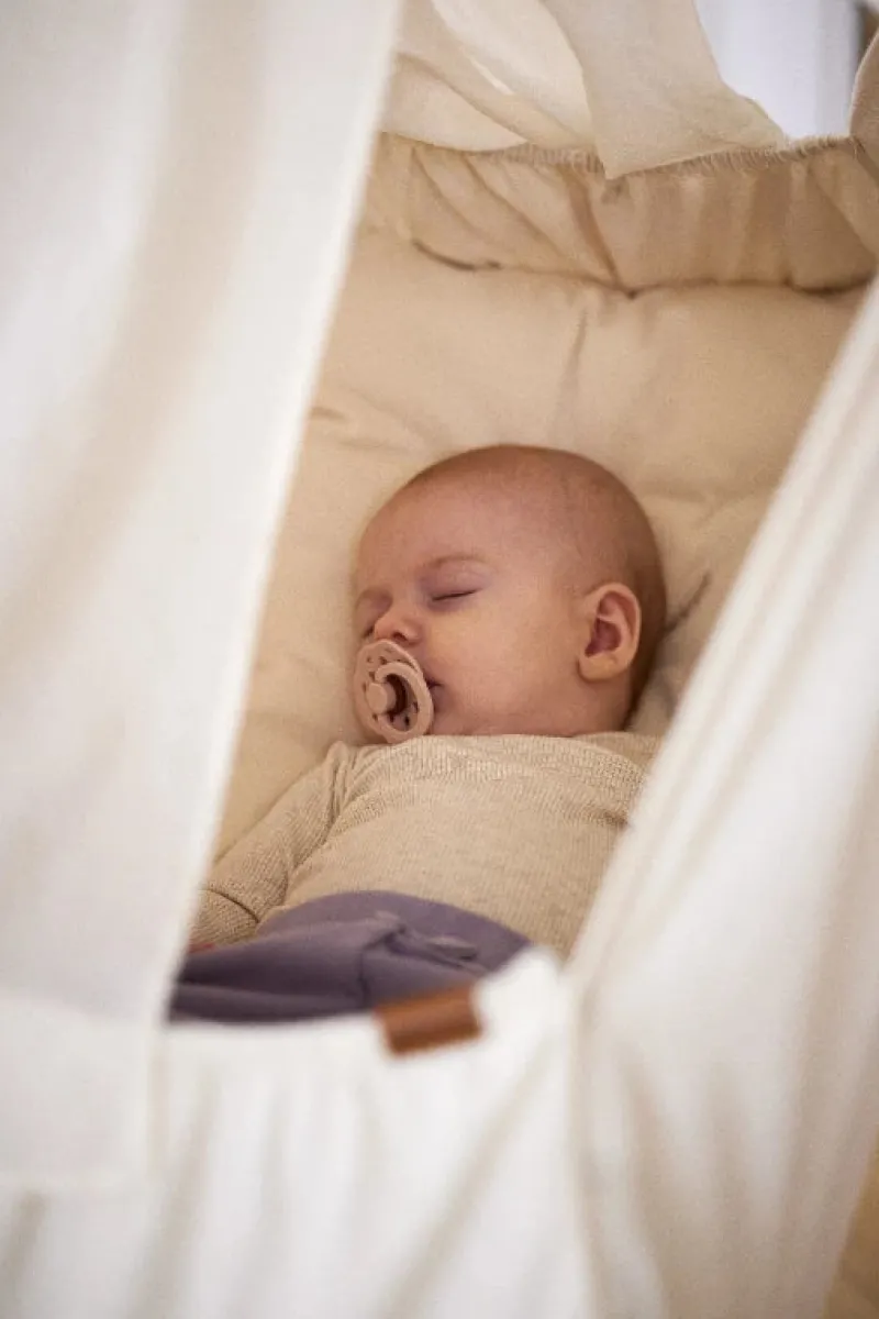 Blød og slidstærk slyngevugge i 100% økologisk bomuld, hvor der medfølger en blød madrads med 100% uldfyld, som gør den åndbar og nem at rengøre.