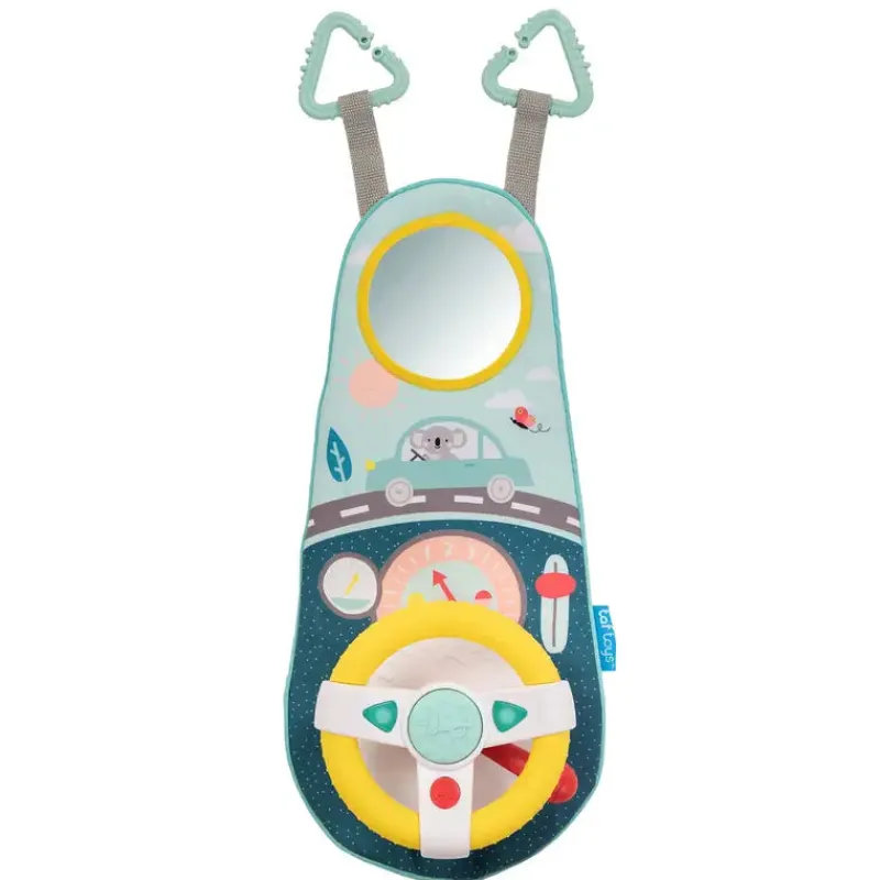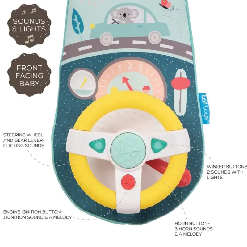 TAF Koala Rat til bilturen med lys og lyd gør bilturen underholdende og lærerig for barnet, der sidder fremadvendt i bilen. Udvikler barnets fin- og grovmotorik, når det drejer på rattet og gearstangen og trykker på aktivitetsknapperne. Lysene og lydene stimulerer udviklingen af ??barnets sanser. De sjove billyde og lyset aktiveres, når barnet trykker på knapperne og lærer om årsag og virkning, og rollelegen udvikler fantasi og sprogfærdigheder.