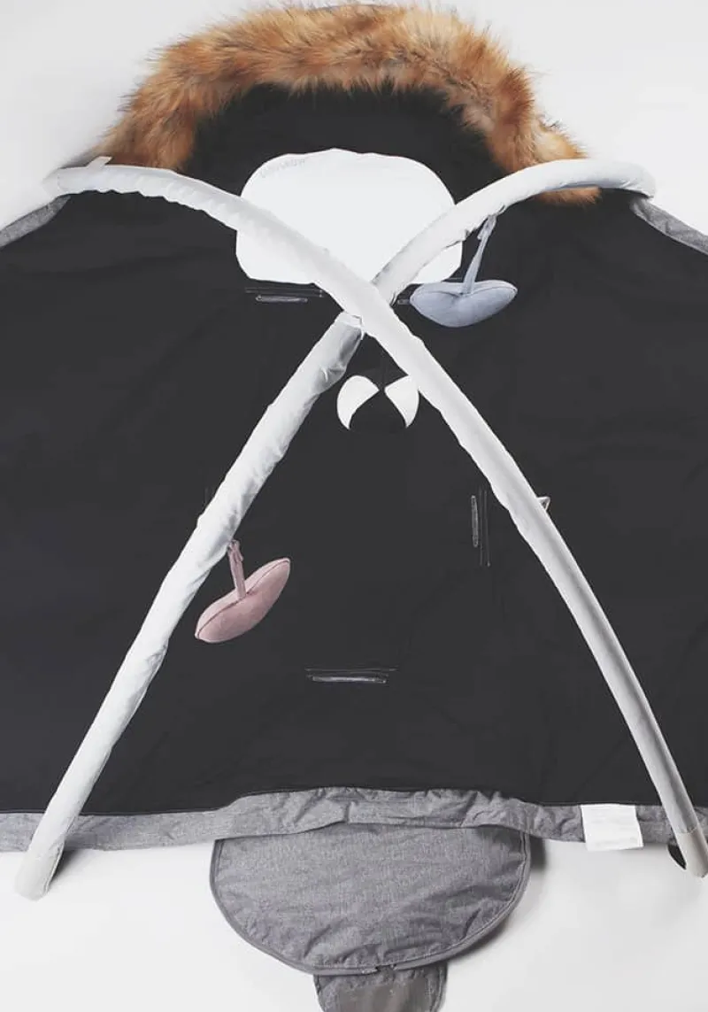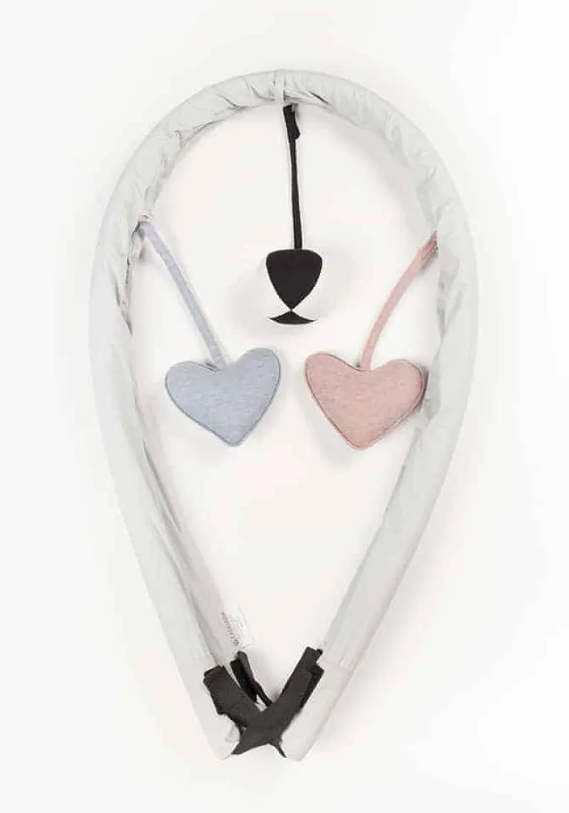 Legetøjsstativ, der passer til Easygrows køreposer, når køreposen foldes ud og bruges som legetæppe. Tilpasset model HOOD, HOOD W, HOOD Norse, Exclusive, NORD og Nature. Til leg og stimulering af barnets sanser og motorik. Leveres med 3 stk. legetøj i blødt stof, der nemt kan sættes på og fjernes igen – bold med klokke og 2 hjerter.