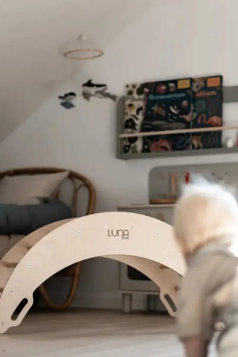 Klatrebuen kræver ikke meget plads derhjemme. Tværtimod vil den tilføje en smuk detalje til hjemmet. Egnet fra spæd- til cirka 7-årsalderen.