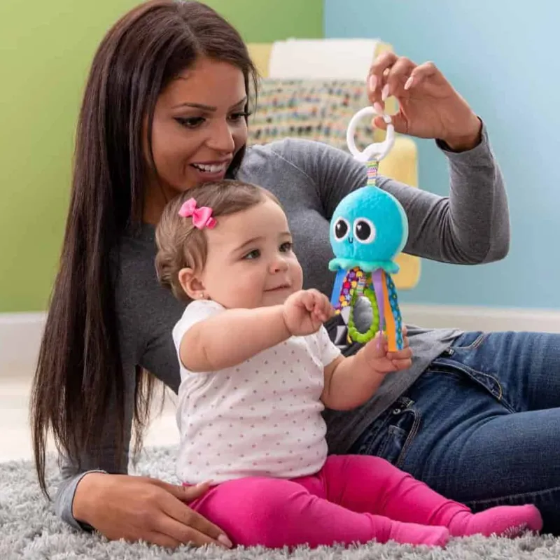 Sød rangle med mange forskellige teksturer og farver der er sjove at udforske. Ranglen er udformet som en lille vandmænd. Den har spændende teksturer der hjælper med at udvikle finmotorik. Utrolig nem at have med på farten med Clip & Go systemet.