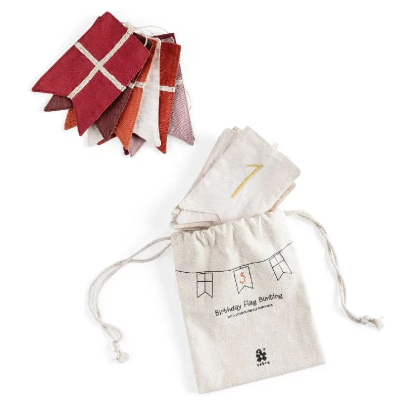 Fødselsdagsflagranke i økologisk bomuld med 11 udskiftelige tal-flag og 6 dannebrogsflag i afstemte røde nuancer.
