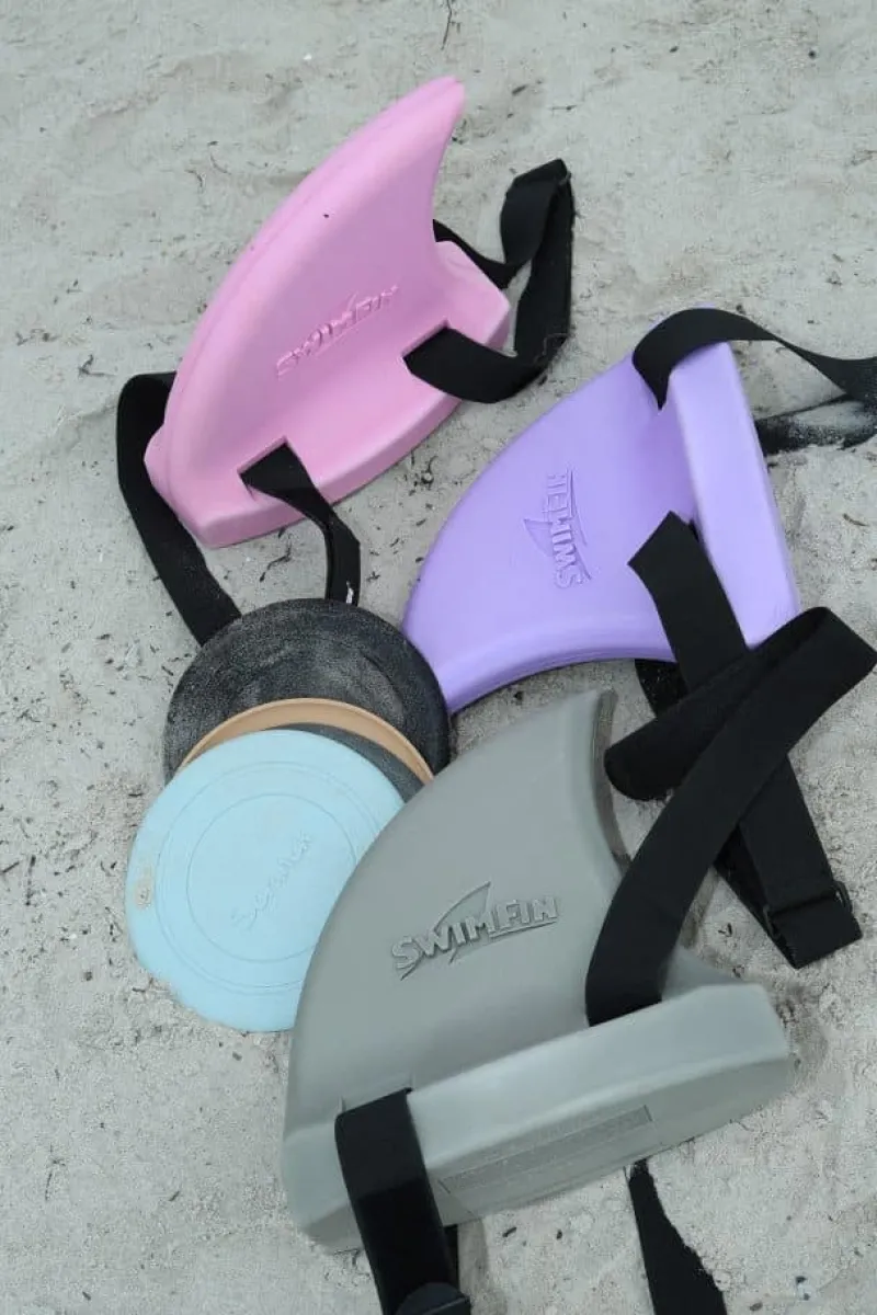 BEMÆRK at dette er et hjælpemiddel til at lære at svømme. Ved længere tids brug kan der opstå gene mod huden, fordi finnen kan kradse en smule. Dette kan nemt løses ved at have badetøj, UV-dragt, T-shirt eller lignende under. Det vil afhjælpe problemet, og så kan der leges og plaskes i vandet uden irritationer.