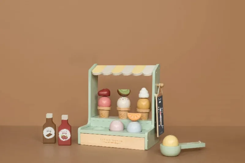 Hvad er din yndlingssmag når du spiser is ? Vanilje eller jordbær? Denne is-butik med sin søde gule og hvide markise invitere dig til at prøve alle 6 forskellige smage. Der er tre vafler, som kan fyldes med de sødeste kreationer og du kan gøre det endnu sjovere med en række farverige toppings. Lad den kreative leg udfolde sig, mens dit barn udforsker glæden ved at drive denne søde is-butik i træ.