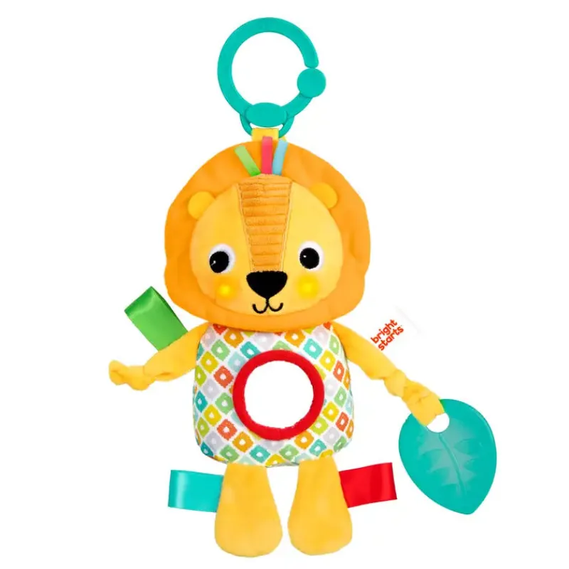 Med bløde blandede materialer og et sødt smil vil denne plysløve følge dig og din baby overalt og opmuntre din baby til selvstændig leg med og udforskning af legetøjet. Løven er lille nok til at passe i enhver pusletaske, og med den medfølgende ring kan du nemt fastgøre løven på babyliften eller klapvognen. På denne måde er en masse sjov og læring altid i nærheden.