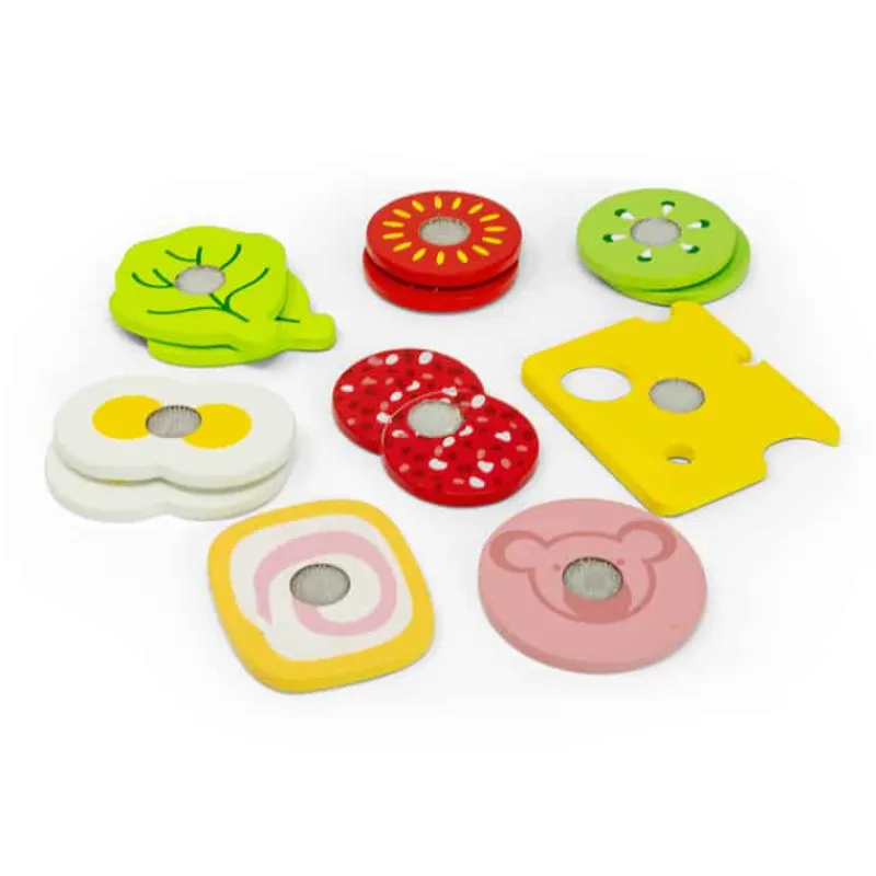 Mamamemo Pålæg med velcro. Legemad i træ – pålæg med pynt! Lige til at komme på brødet fra mamamemo. Børn elsker at lave mad og servere for dukkerne eller for far og mor.