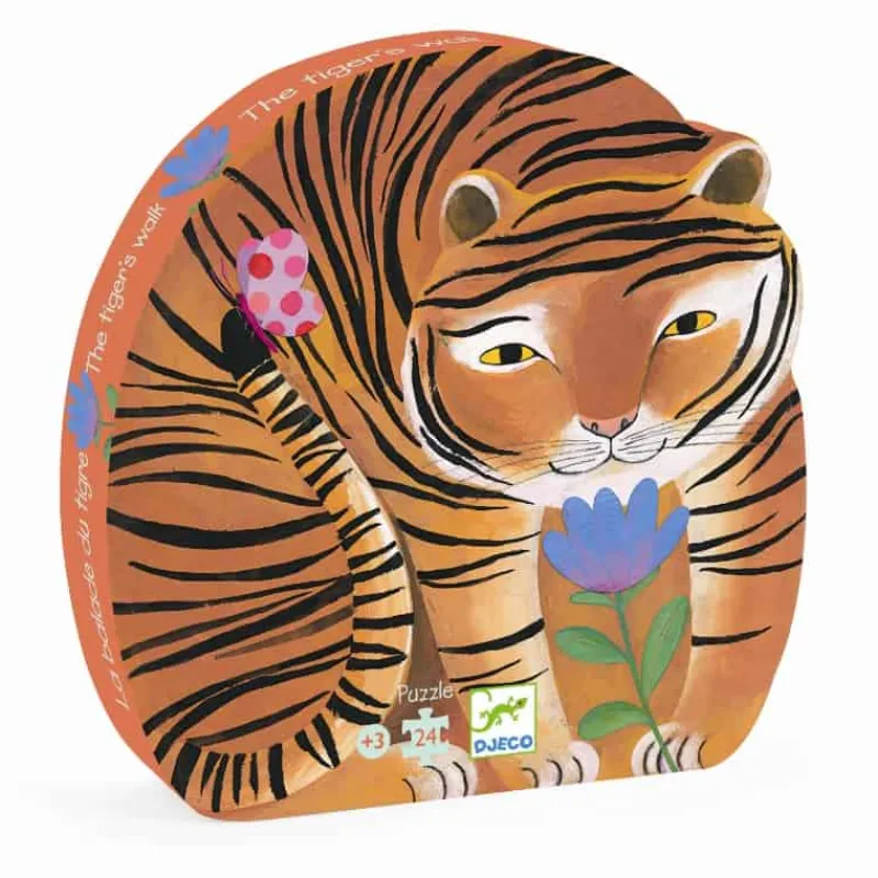 Klassisk Silhuet puslespil fra Djeco med 24 store kraftige brikker. Her en flot møntret tiger.