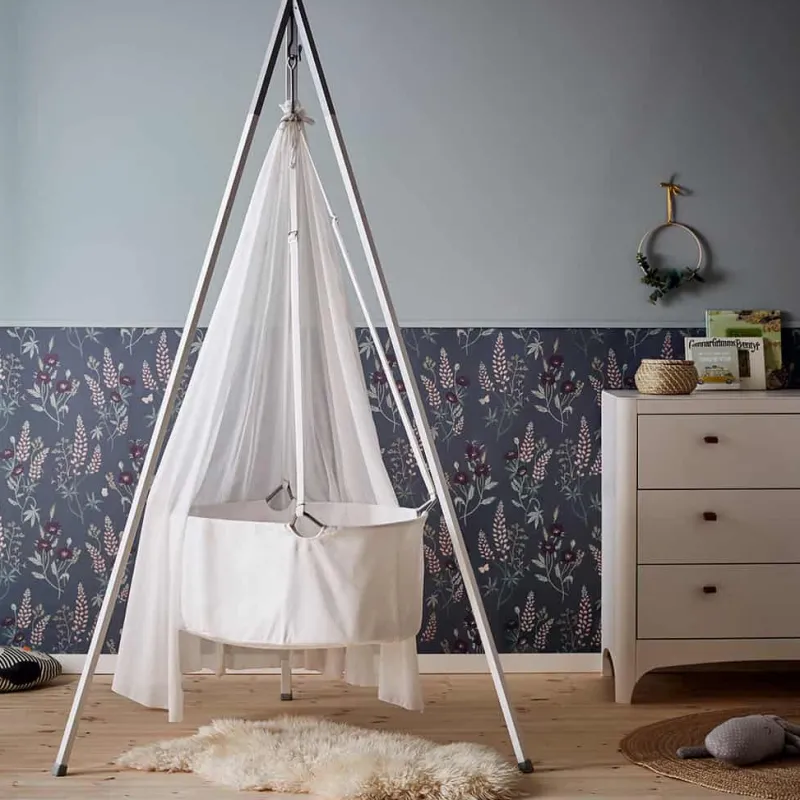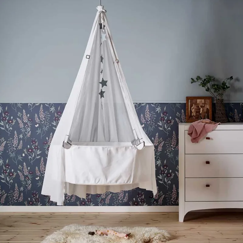 Den fine, lette himmel indrammer Leander Classic™ vuggen og fungerer samtidig som en beskyttende hule for barnet. Himlen fremhæver det æstetiske i vuggen både med og uden stativ.