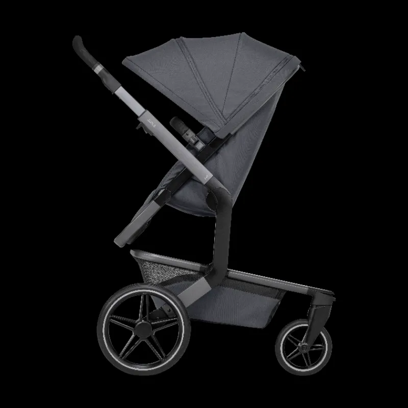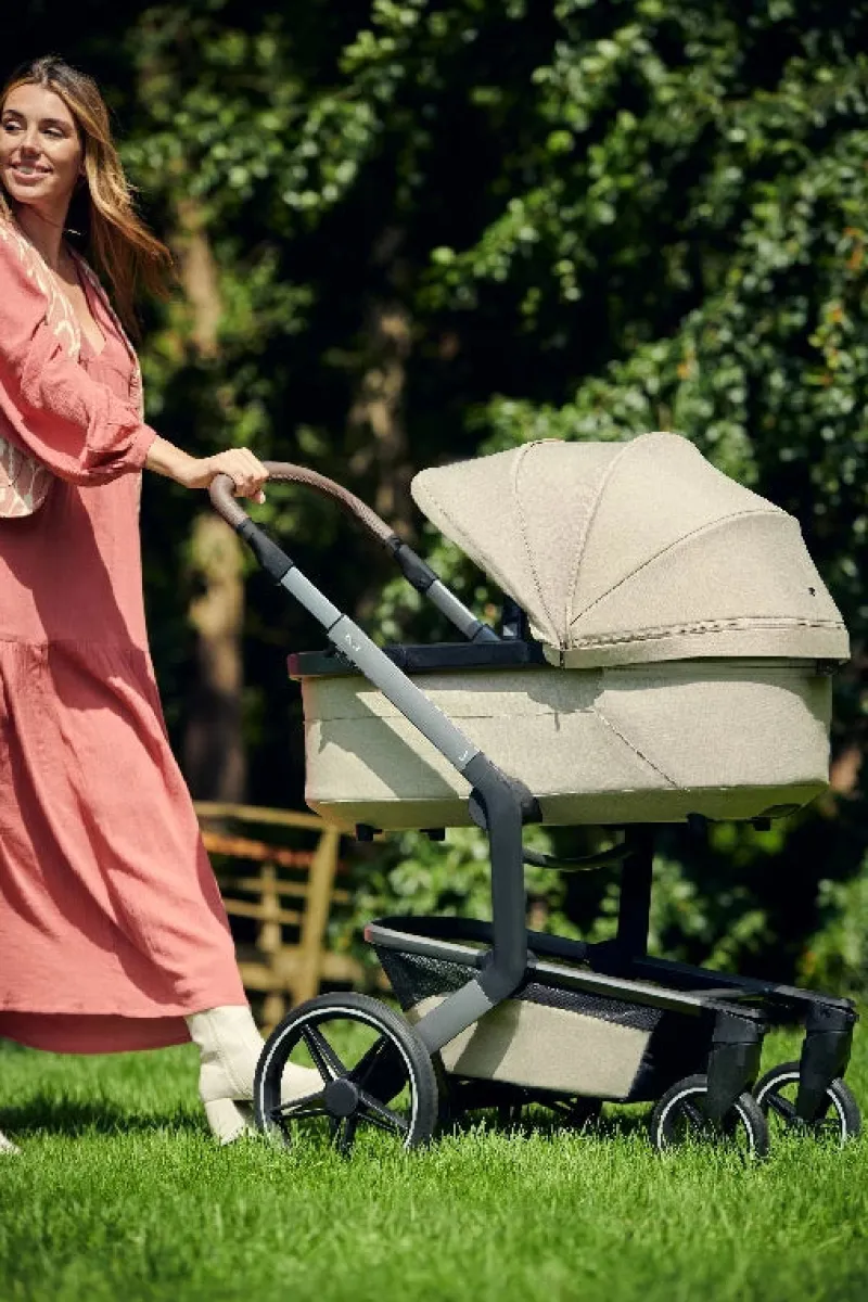 Joolz Day + kører utroligt let takket være det nye lette hjuldesign, og med enhåndsstyring er Joolz Day + let at manøvrere. Day+ har affjedring på alle 4 hjul, så du skal bare nyde turen i byens parker, på brostenene eller lås de drejelige hjul for mere komfort på ujævne veje eller i skoven.