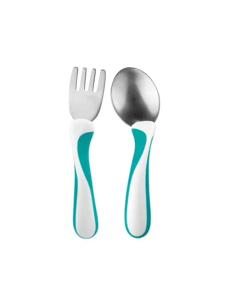 Bambino My first FORK & SPOON mint. Baby begynder bestik i rustfrit stå og ergonomisk udformede greb, der er nemt for barnet at holde selv. Bambino baby bestik der hjælper barnet med at lære at spise selv