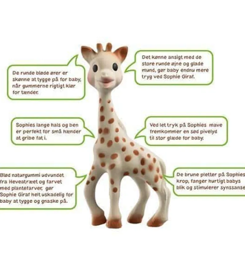 Sophie Giraf bliver hurtigt din babys foretrukne legetøj, da hun besidder de bedste evner, og allerede fra 3 mdr’s alderen stimulerer alle babyens 5 sanser. Sophie Giraf er lavet af 100% naturgummi, som er helt fri for BPA eller phthalater og farvet med ugiftige plantefarver. Giraffen er let at gribe fat i med sin lange hals og ben, og de bløde runde ører er behagelige for babyen at gnaske på, særligt når gummerne klør for tænder.