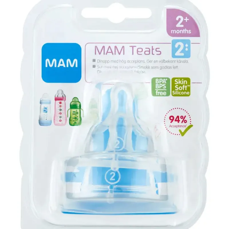 Flaskesut i silkeblød silikone, MAM SkinSoft, hvis overflade minder om mors hud og gør det nemt at skifte mellem amning og flaske. Størrelse 2 er til modermælk, vand og modermælkserstatning. Passer til alle flasker fra MAM.