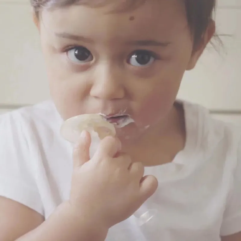 Fremstillet af blød 100% fødevaregodkendt silikone, hvilket gør tandbørsten sikker for dit barn at tygge og sutte på.