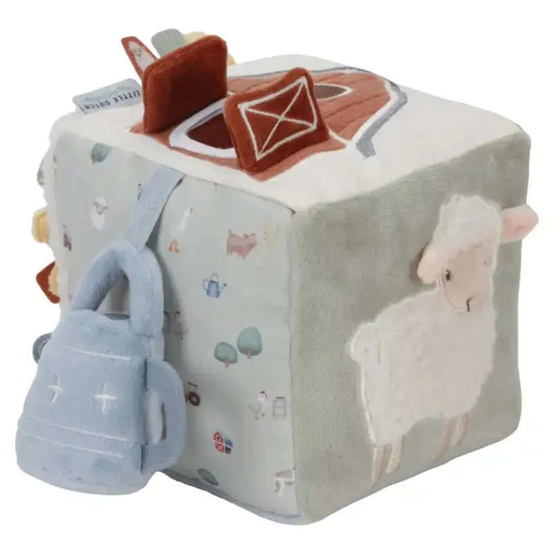 Tag med på eventyr på bondegården! Den superbløde aktivitetsterning i flotte farvetoner vil helt sikkert vække din lille barns nysgerrighed. Hver side er udsmykket med en forskellig aktivitet med forskellige teksturer og former, der hjælper med sensorisk udvikling og giver uendelig underholdning. Terningen er let at gribe at holde i for små hænder, roteres og den indeholder et spejl til selvopdagelse.