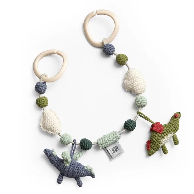 Håndhæklet barnevognskæde med økologiske bomuldsfigurer fra Sebras tema Dragon Tales – en fortælling om drager og riddere.