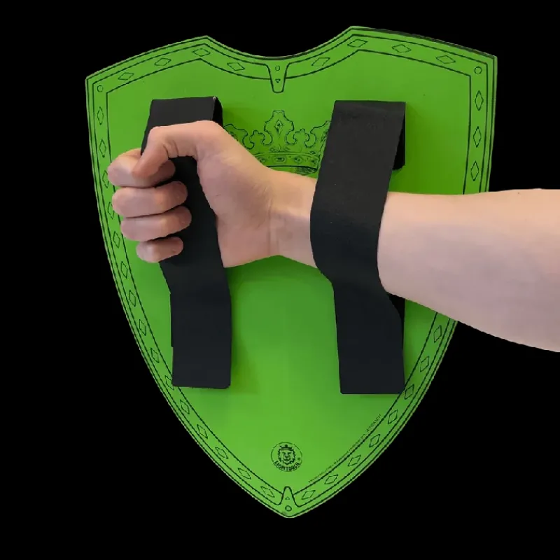 Kongemager-skjoldet er lavet i let og sikkert skummateriale med velcro-stropper på bagsiden, der sikrer en god og behagelig pasform under leg og kamp.