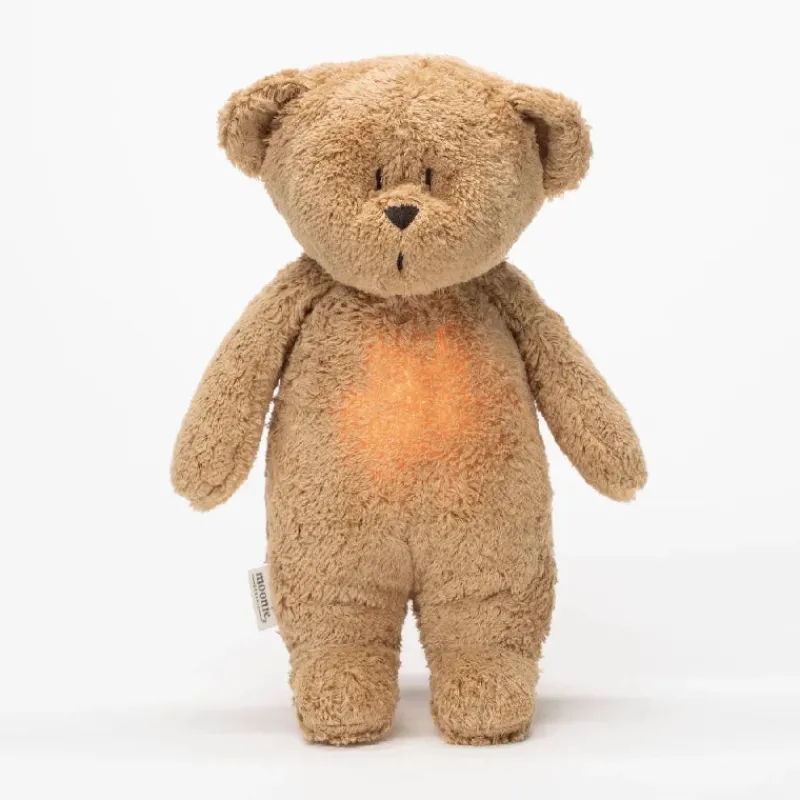 LED-lampen varmer ikke op, den er helt sikker. Lampen til den brummende MOONIE-bjørn er også fantastisk til større børn, som ofte har mareridt og er bange for mørket. Du kan tænde selve natlampen uden lyd og lade den være tændt hele natten.