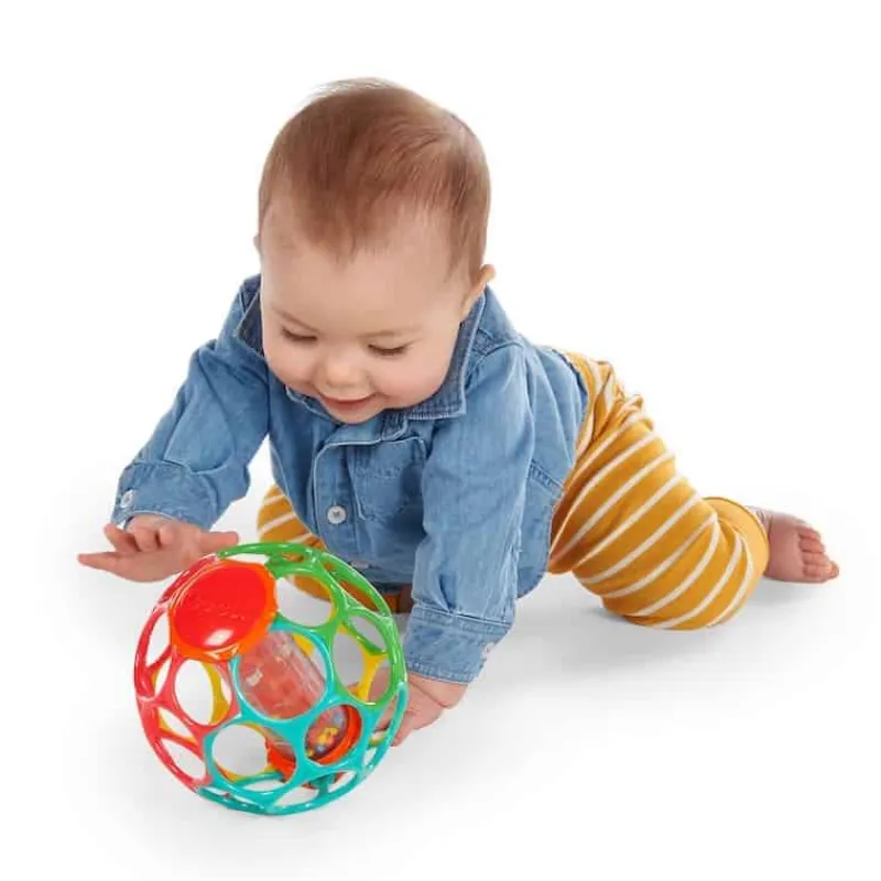 Denne bold er lavet med 30 huller til små baby fingrer, så selv de mindste hænder kan gribe, bøje og ryste bolden. Ved hvert rul vil babyen høre lyden af ranglen, der lyder som regn der falder. Regnbue perlerne i ranglen, vil hjælpe med udviklingen af babyens motoriske færdigheder.