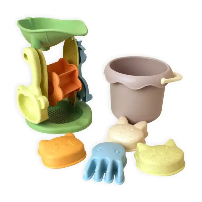 Strandsæt i hvedestrå. Sættet består af mølle, spand, skovl, rive + 4 forme i forskellige figurer. 8 dele i alt. 3+