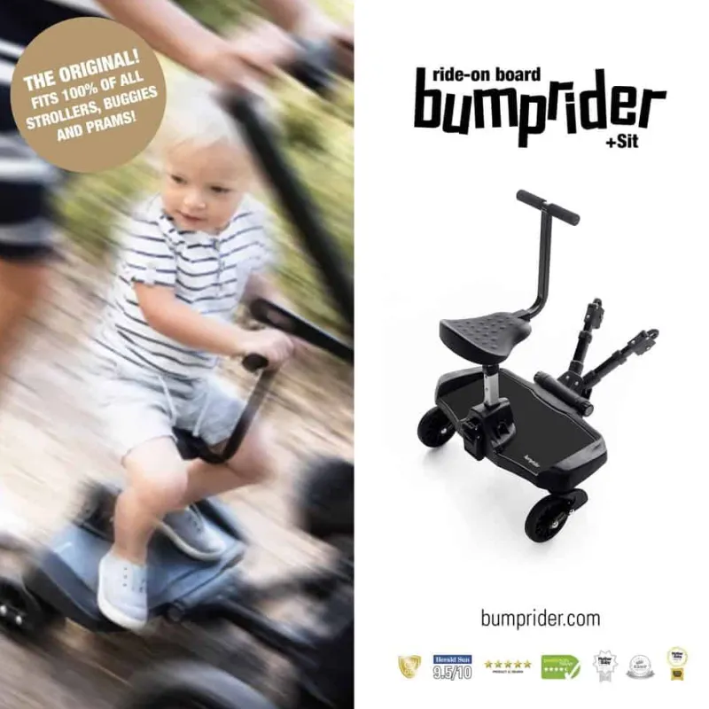 Innovativt 2-i-1 ståbræt, der kan monteres på 99% af alle klapvogne. Sædet monteres let på ståbrættet, når junior bliver træt i benene. Sædet kan vendes til 2 kørselsretninger, samt højdejusteres til 3 positioner. Stødabsorberende skater-hjul.